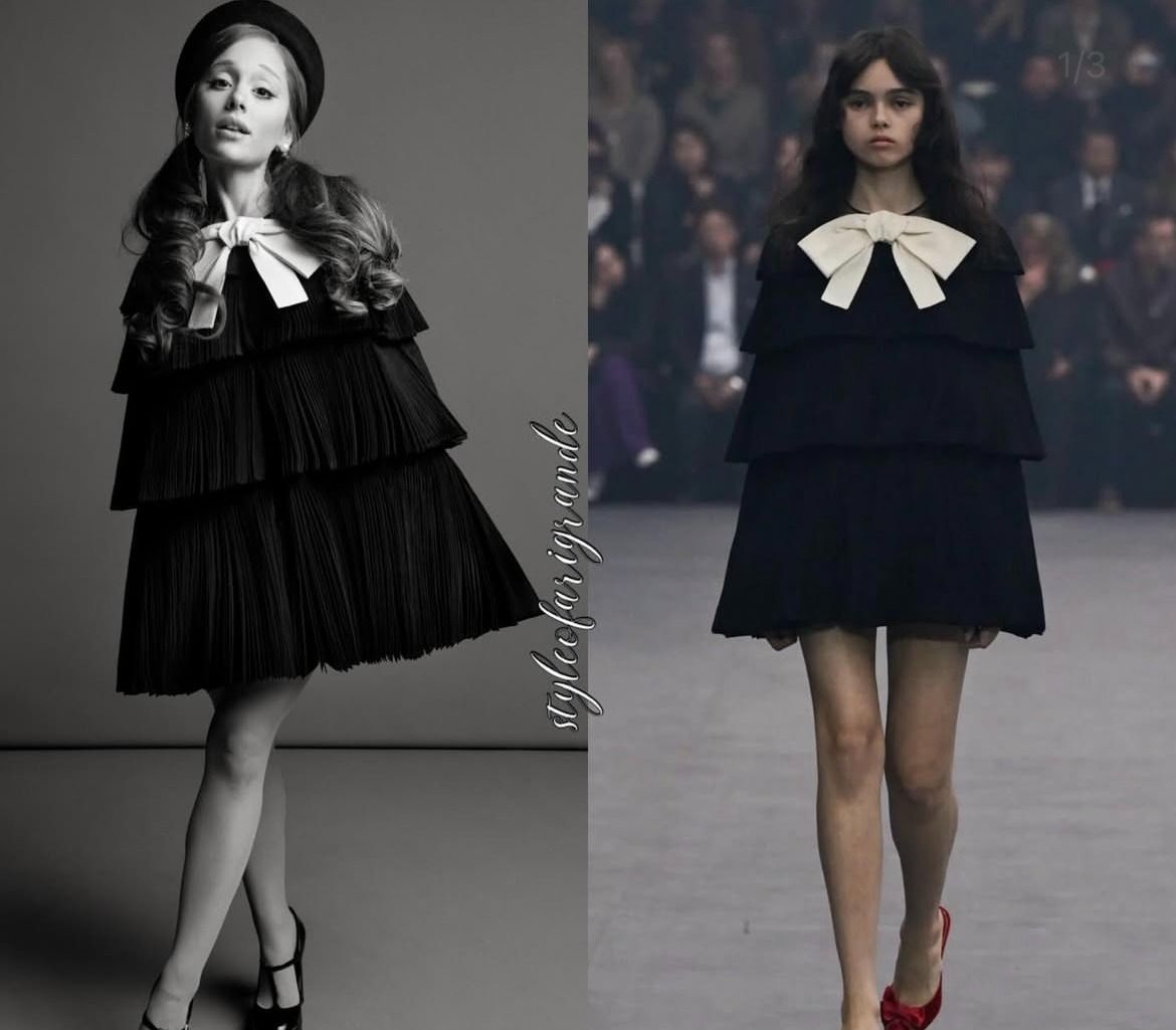Ariana is Wearing a dress from the @MaisonValentino "Spring 2026 Ready-to-Wear Collection" ($N/A), @JimmyChoo "Marene 120 Leather Mary Jane Pumps" ($1,150), & the @GigiBurris "Laura Wool-Felt Pillbox Hat in Black" ($395).